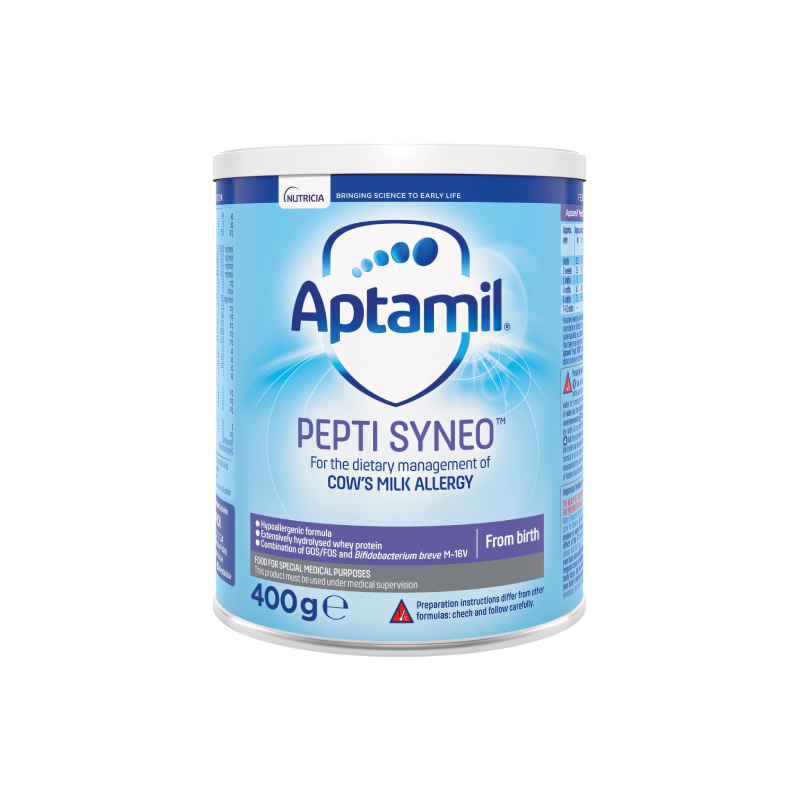 Meet Aptamil Pepti Syneo, a gentle and effective formula created for babies with cow's milk allergy. This special formula, suitable right from birth, is both hypoallergenic and nutritionally complete, making it ideal for your baby's early months. It's designed with unique ingredients like GOS/FOS and Bifidobacterium breve M-16V to care for your little one's dietary needs. Aptamil Pepti Syneo is available in convenient 400g and 800g tins, offering peace of mind as either the main nutrition up to 6 months or as part of a varied diet thereafter.